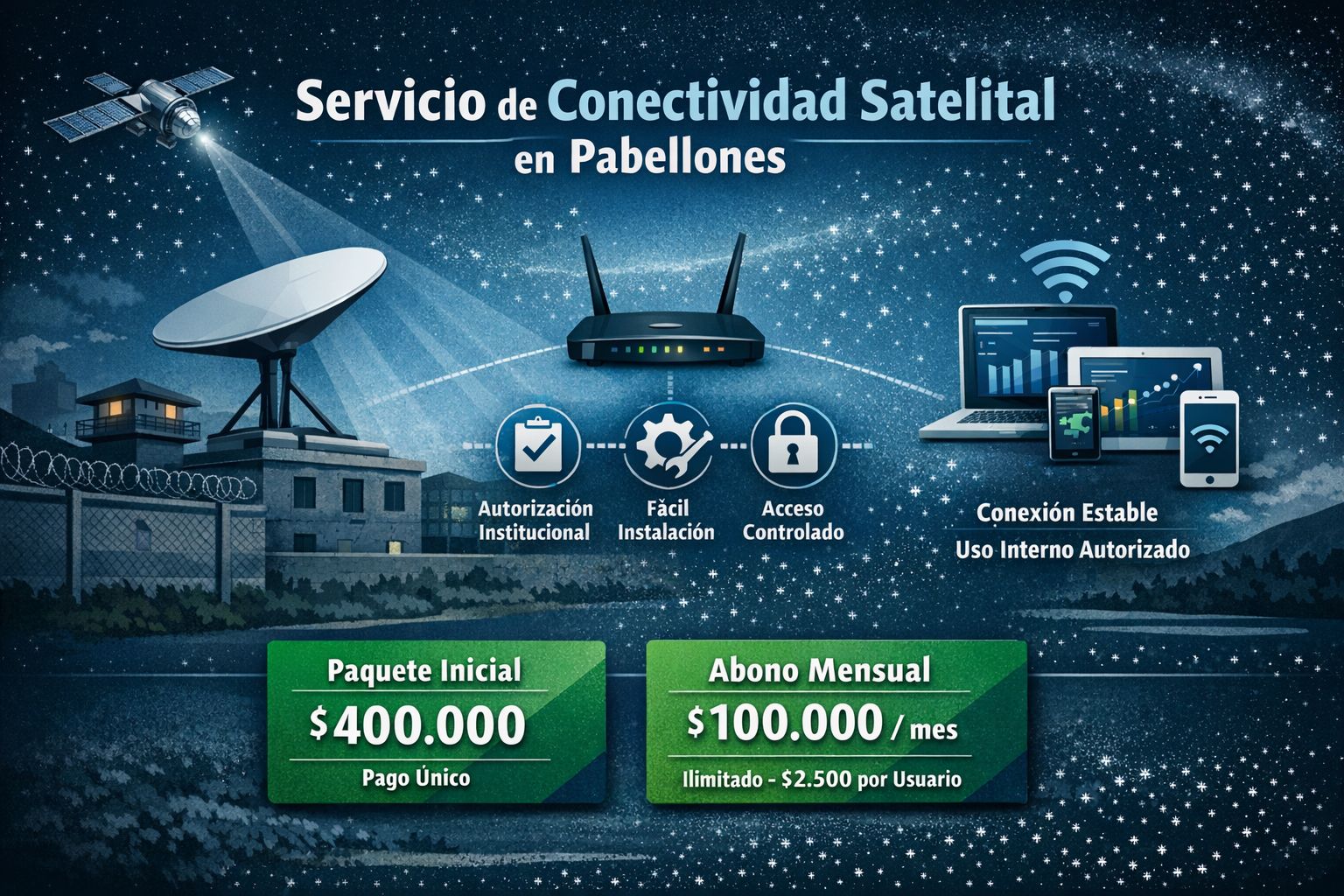 Solución de conexión mediante antena satelital para pabellones, orientada a brindar acceso controlado, estable y de fácil implementación.